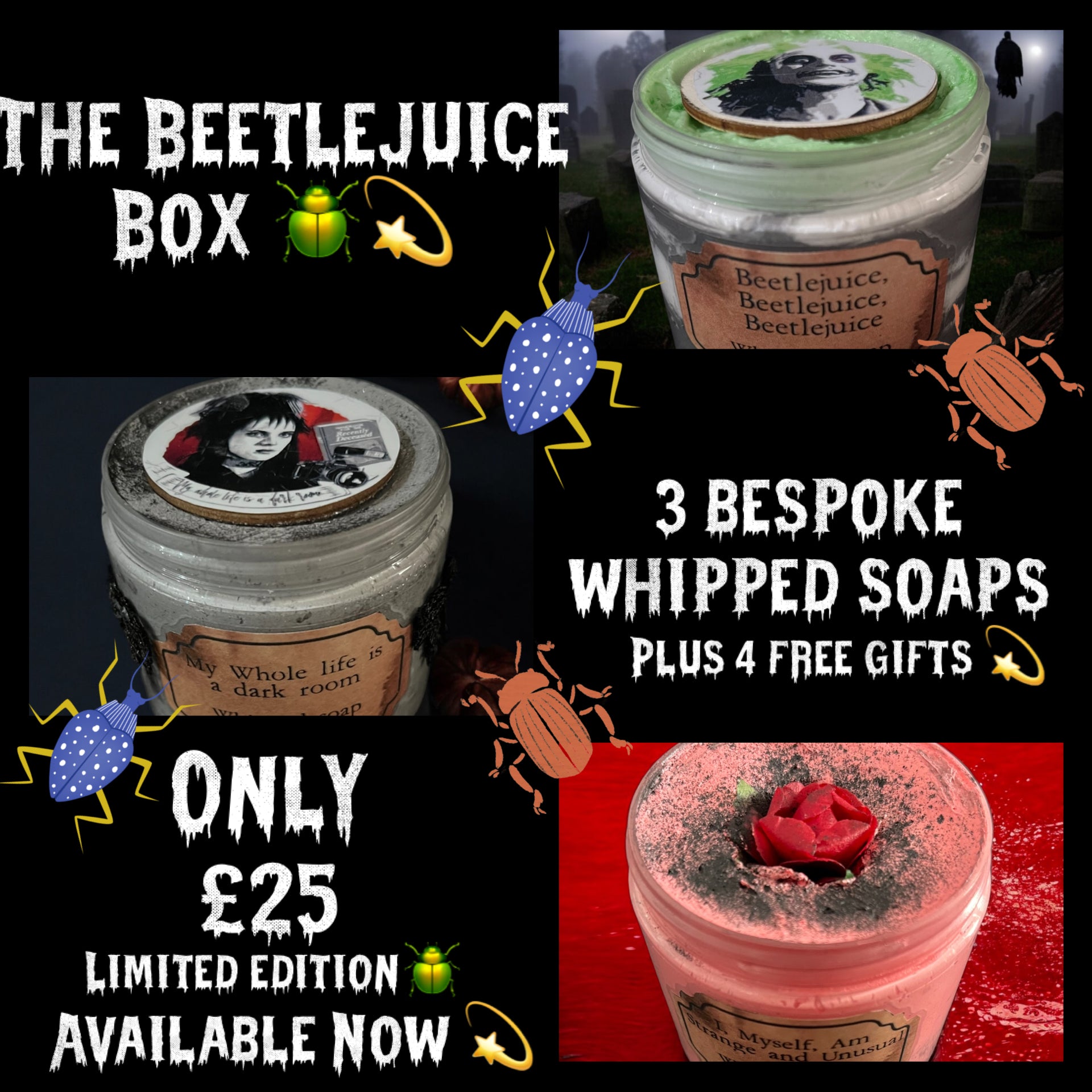 Our special edition Beetlejuice box is the perfect gift for any fan of the iconic movies! It contains our 3 bespoke Beetlejuice themed whipped soaps 🪲💫