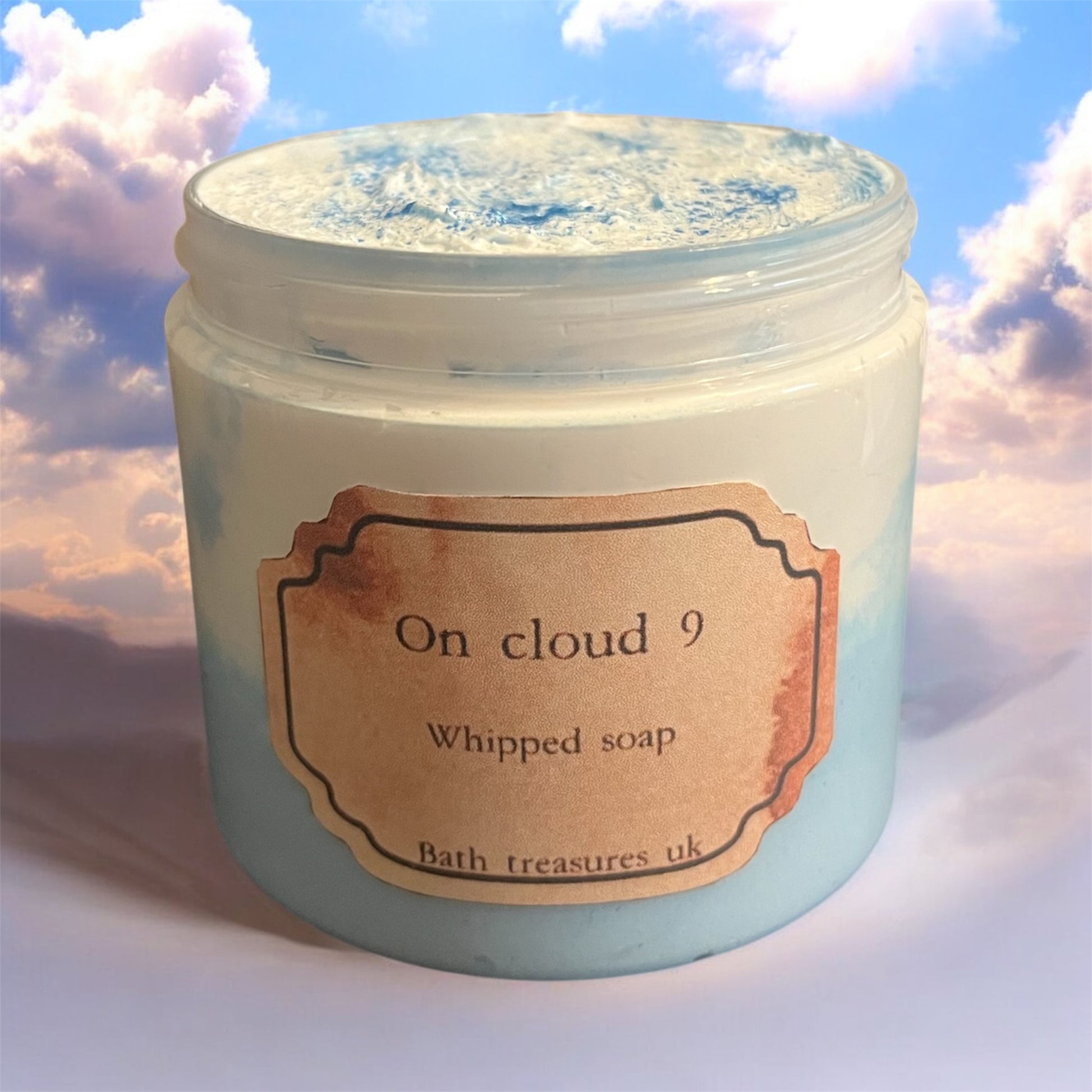 Our “ On cloud 9” whipped soap has top notes of Lavender, Pear and Bergamot; middle notes of Whipped cream, Praline, Coconut and Vanilla orchid and base notes of Musk and Woody Notes 💫