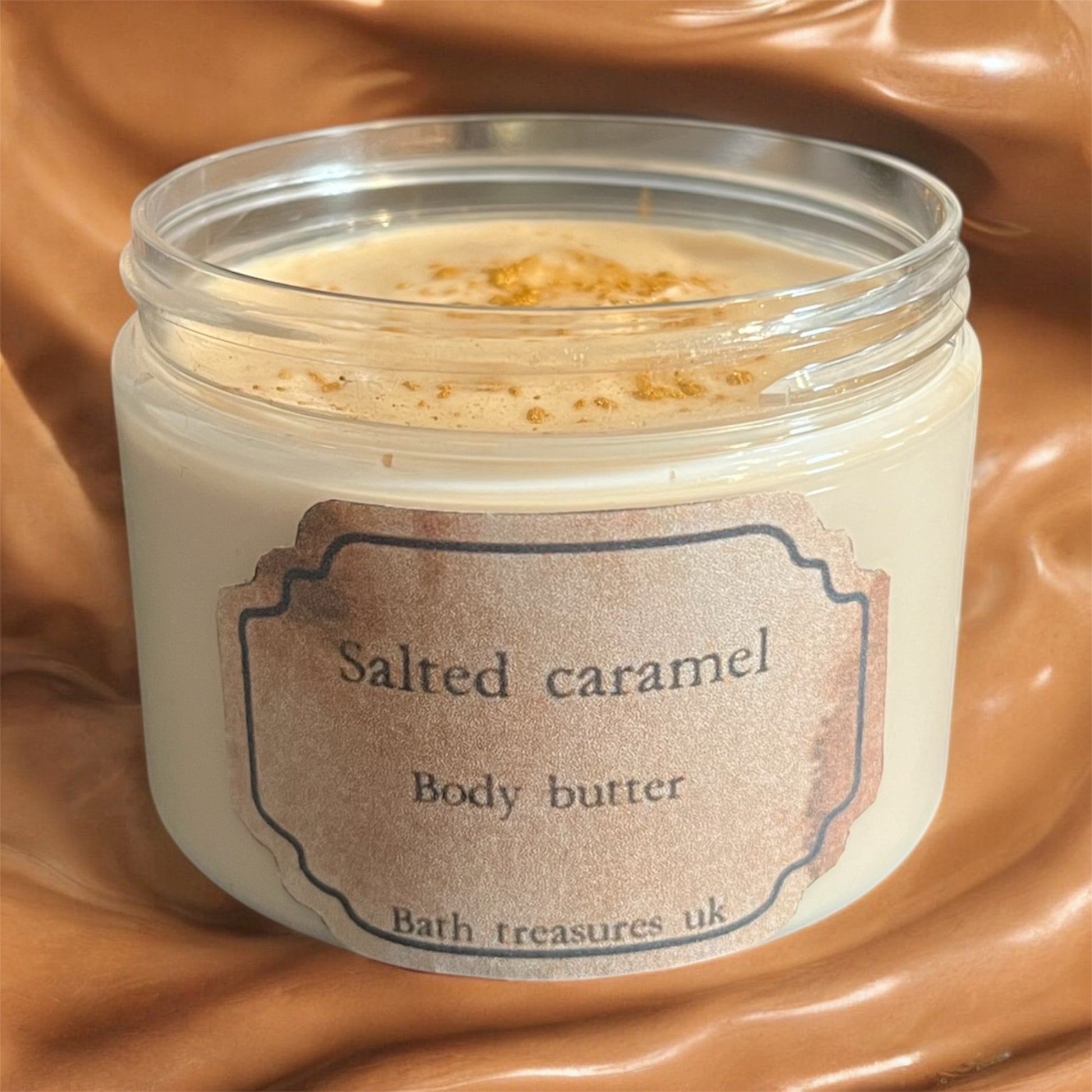 Our “salted caramel” body butter is a rich creamy fragrance with notes of sweet caramel, brown sugar and smooth vanilla alongside a salted butter nuance creating a mouthwatering accord 💫